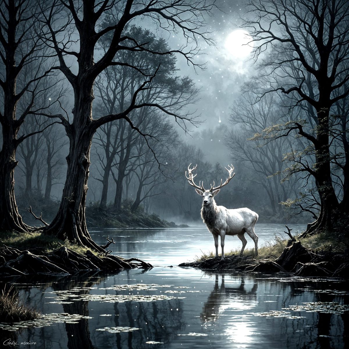 A striking picture of a white stag at the water's edge in a misty landscape. The stag has leaves wrapped around its antlers, illuminated by moonlight and scattered stars, in an ethereal pre-raphaelite style.