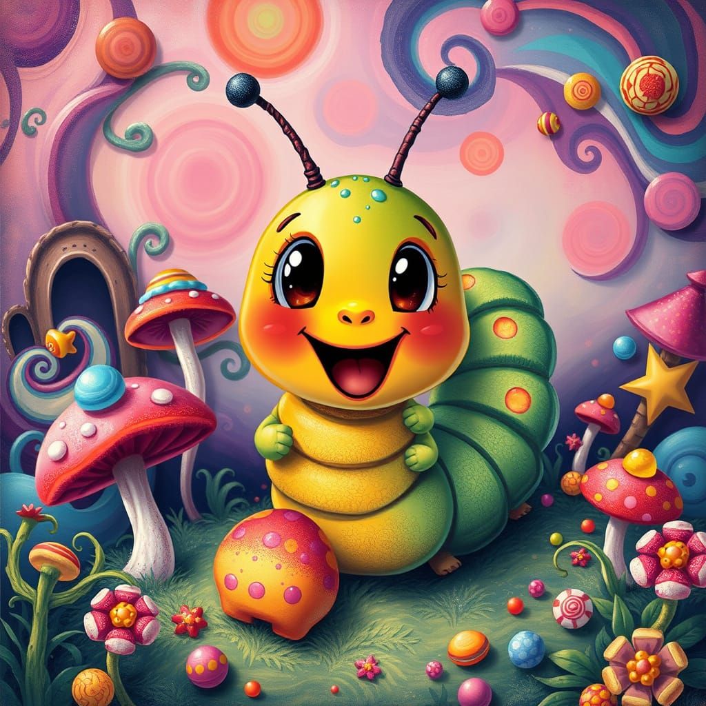 A vibrant caterpillar in a swirling wonderland enjoys a mushroom. The image features bold, fantastical, dreamlike qualities, with highly detailed patterns in a gouache style.