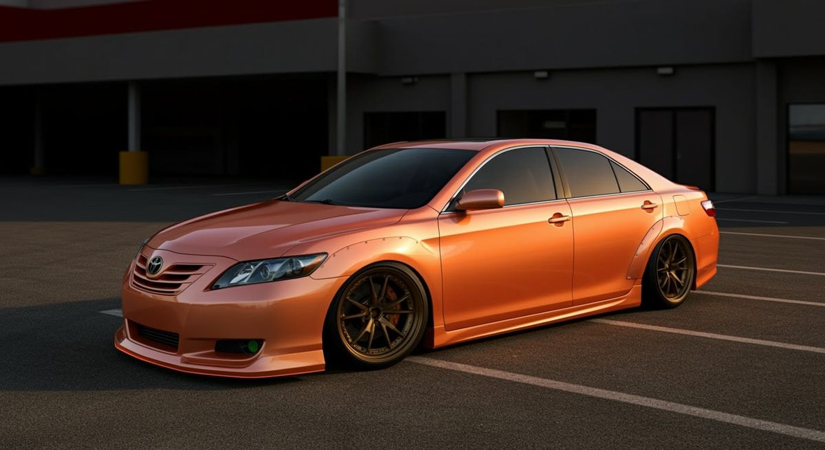 This image shows a 2006 Toyota Camry transformed into a high-performance muscle car, featuring a bold peach paint job, aggressive styling, and a sleek, sporty interior, set against a warm sunset background.