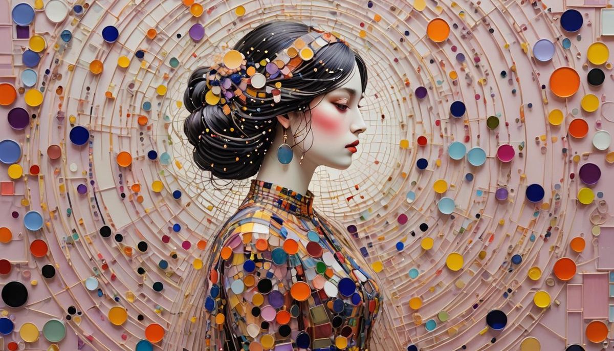 Masterpiece, intricate Dada art, delicate glass string art, fashionista Waterhouse woman with a clearly defined and beautiful face, flowing dress of colorful dots and squares and geometric shapes, 3D texture brushlines, pink, orange, lemon, violet, and yellow, and complementary colors, ethereal aesthetic, ...