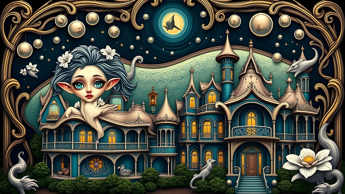 This image showcases a highly detailed, unique Art Nouveau mansion with a rich color palette and cinematic backdrop. It features intricate architectural elements and a whimsical aesthetic.