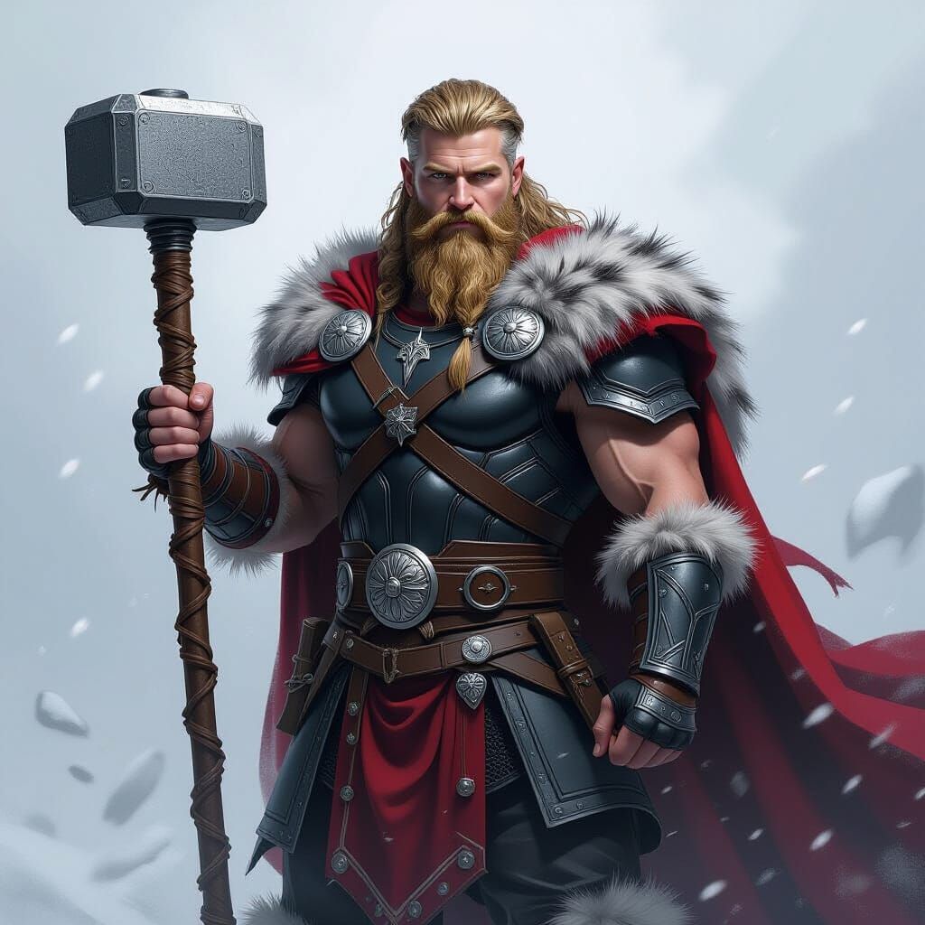 Amidst the unforgiving bite of a winter storm, the God of Thunder stands unyielding. Clad in armor and fur, with his legendary beard and a gaze as sharp as the blizzard's edge, he is the embodiment of primal strength. Mjolnir, held firm in his grasp, waits for the moment to answer the call of the storm and unleash its fury upon the world.