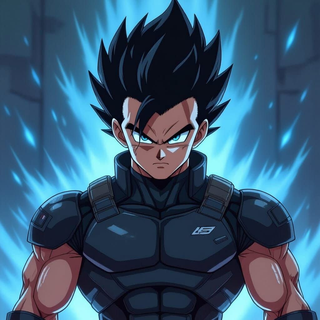 A male Saiyan with a tail and blue eyes, dressed in a black tactical suit, sports a fauxhawk hairstyle. This image captures a powerful anime-inspired character.