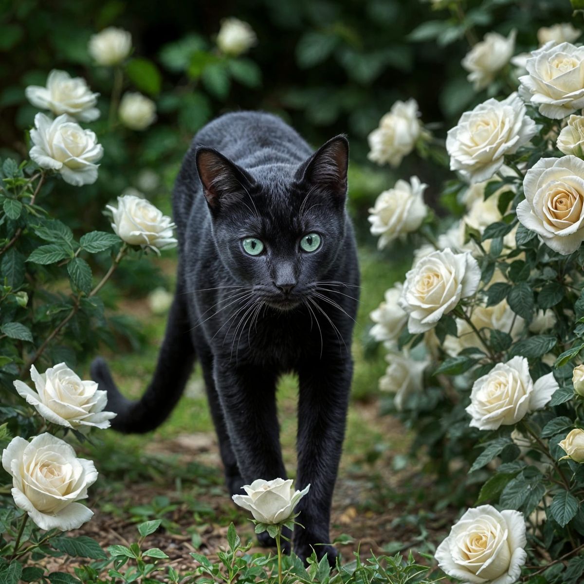 This serene image depicts a stunning emerald black cat wandering through a lush garden filled with vibrant white roses, evoking a sense of peaceful realism.