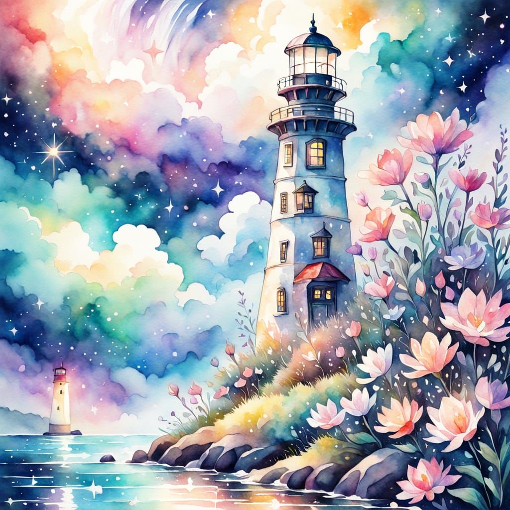 A dreamy watercolor painting of a flower next to a cosmic lighthouse. The artwork employs soft textures, whimsical brushstrokes, and a pastel color scheme to create an ethereal aesthetic.
