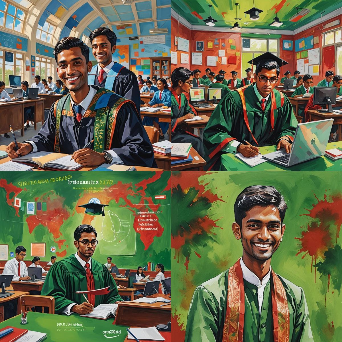 A poster design advertising study abroad programs. The poster features contact information, an apply now button, and a student in graduation attire, against a vibrant green and red background.