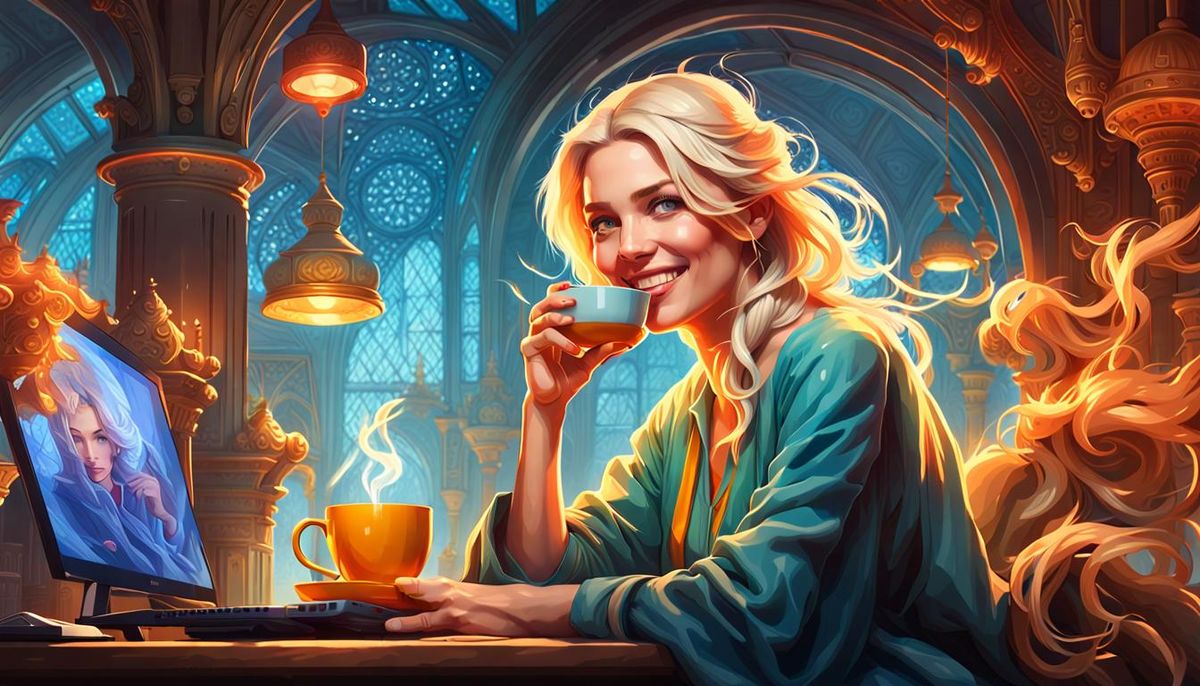 A digital portrait of a smiling blonde woman in her thirties drinking tea at her computer. The image features dynamic lighting and intricate details in an art deco style.