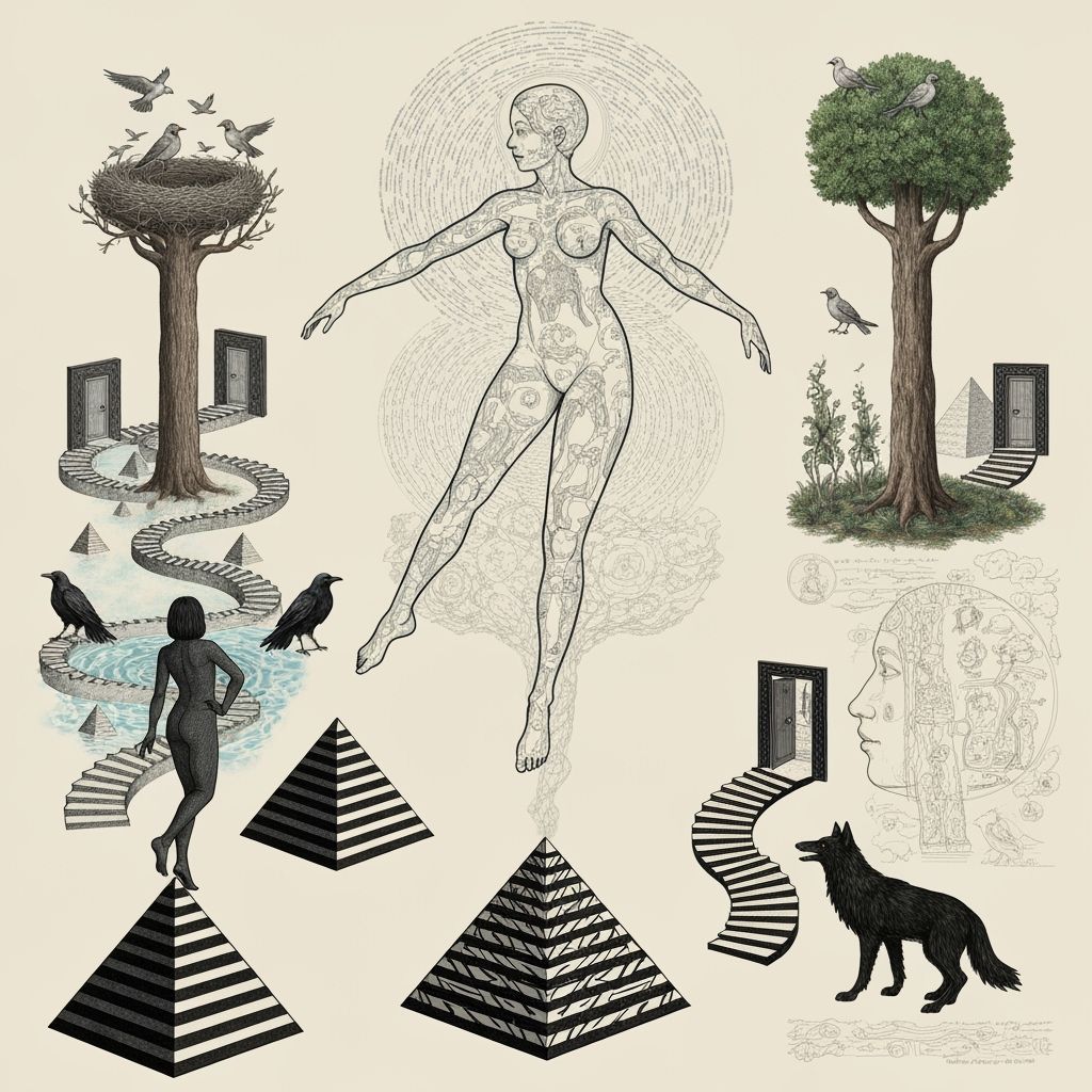 This image shows a glowing figure dancing amidst codes and patterns. The artwork depicts a surreal and dreamlike utopia, with a focus on the interconnectedness of nature and inner life. The style is reminiscent of detailed concept art.