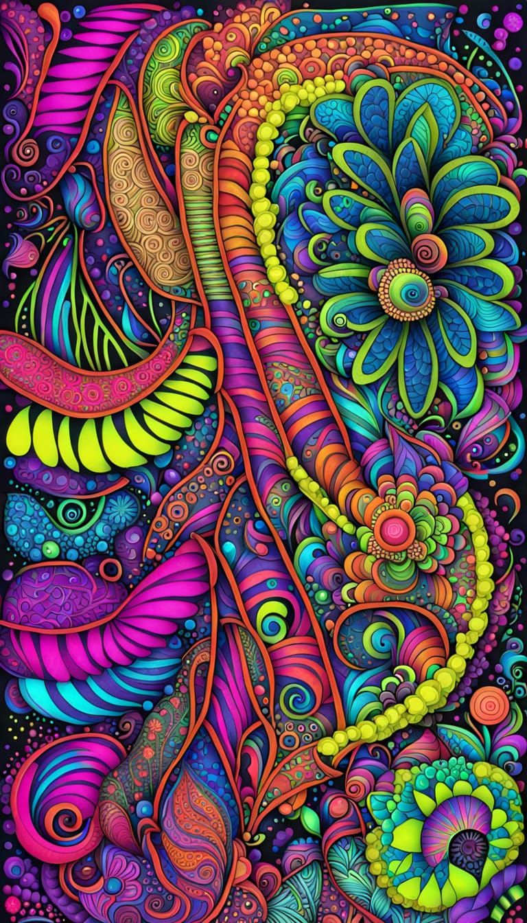 This image shows a fluorescent, psychedelic zentangle pattern. The artwork features neon colors and complex, interwoven designs reminiscent of hallucinatory visions.