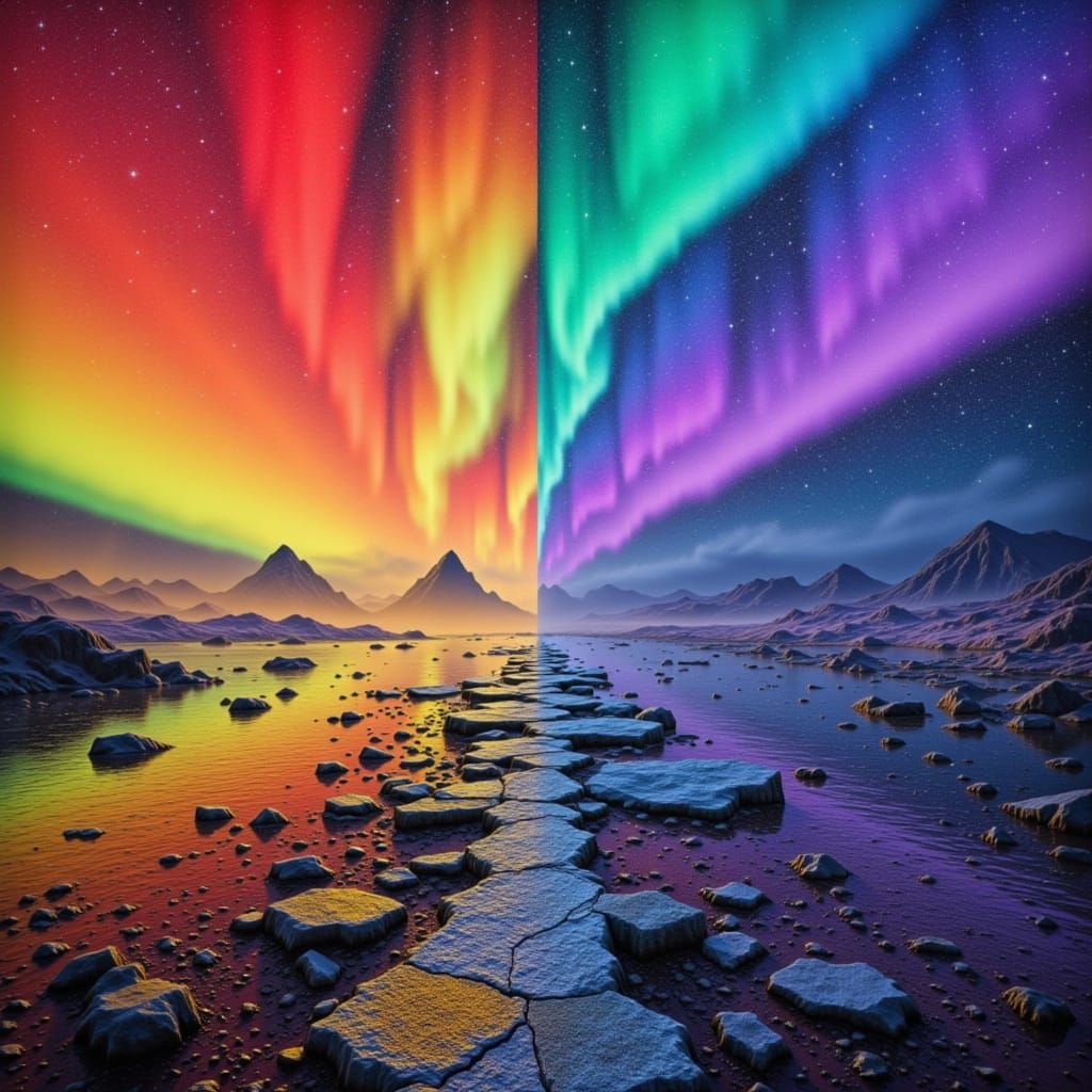 This surrealist artwork depicts a vivid aurora borealis seamlessly merging with intricate lace, creating a striking visual paradox. The image features ethereal lighting and a dreamlike quality.