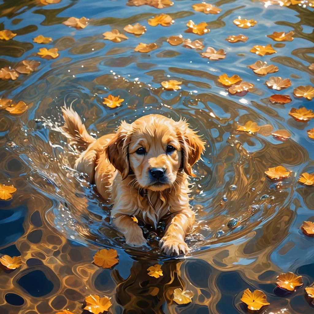 A vibrant image of a golden retriever puppy playing in a pool. This stylized digital art piece captures a fantastical summer scene with glowing sunlight and intricate details.