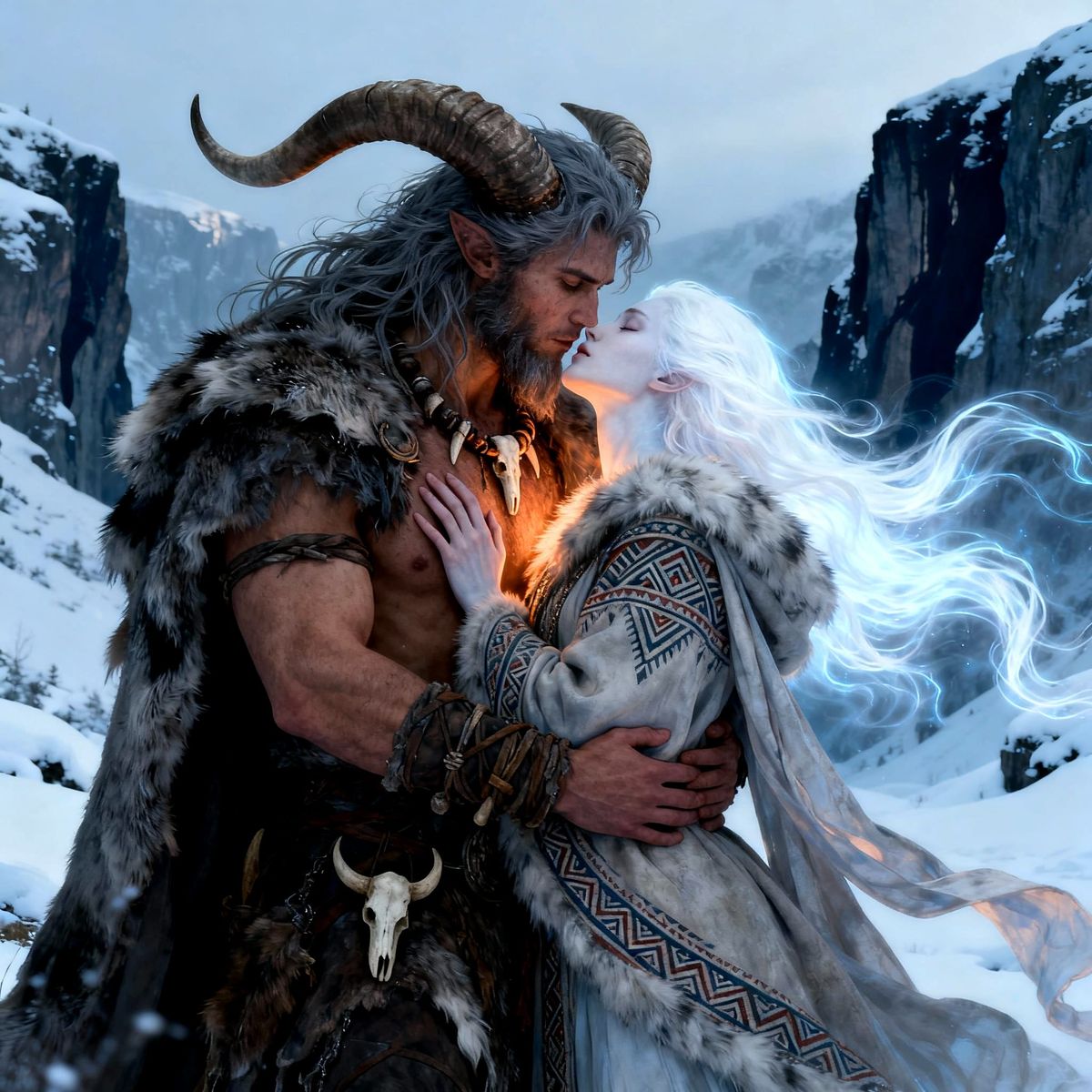 A hyper-realistic, cinematic scene of a forest deity and an ethereal woman in a passionate embrace amidst a harsh winter landscape. Detailed illustration with tribal and rustic elements.