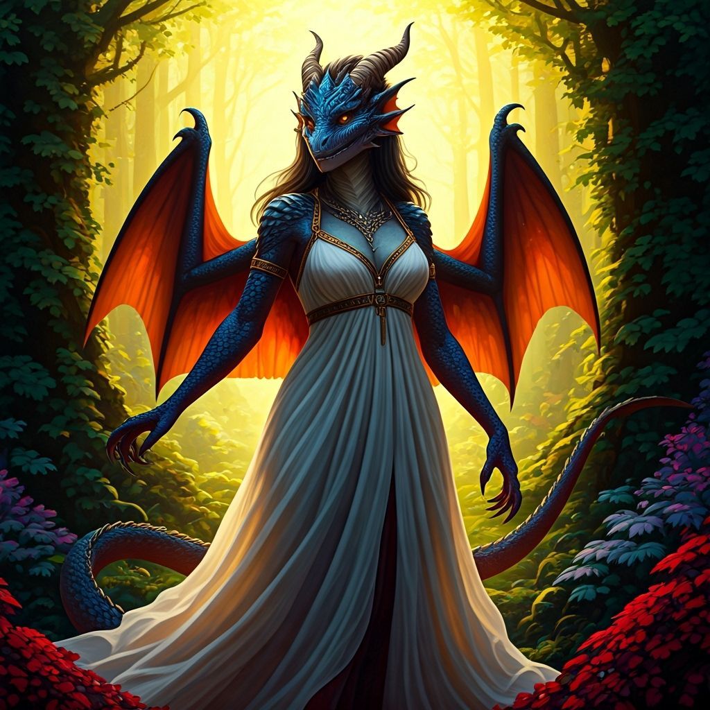 This image shows a humanoid dragon woman with scales and wings in a flowing gown, set in a mystical forest. The artwork is rendered with vibrant colors and dynamic brushstrokes.