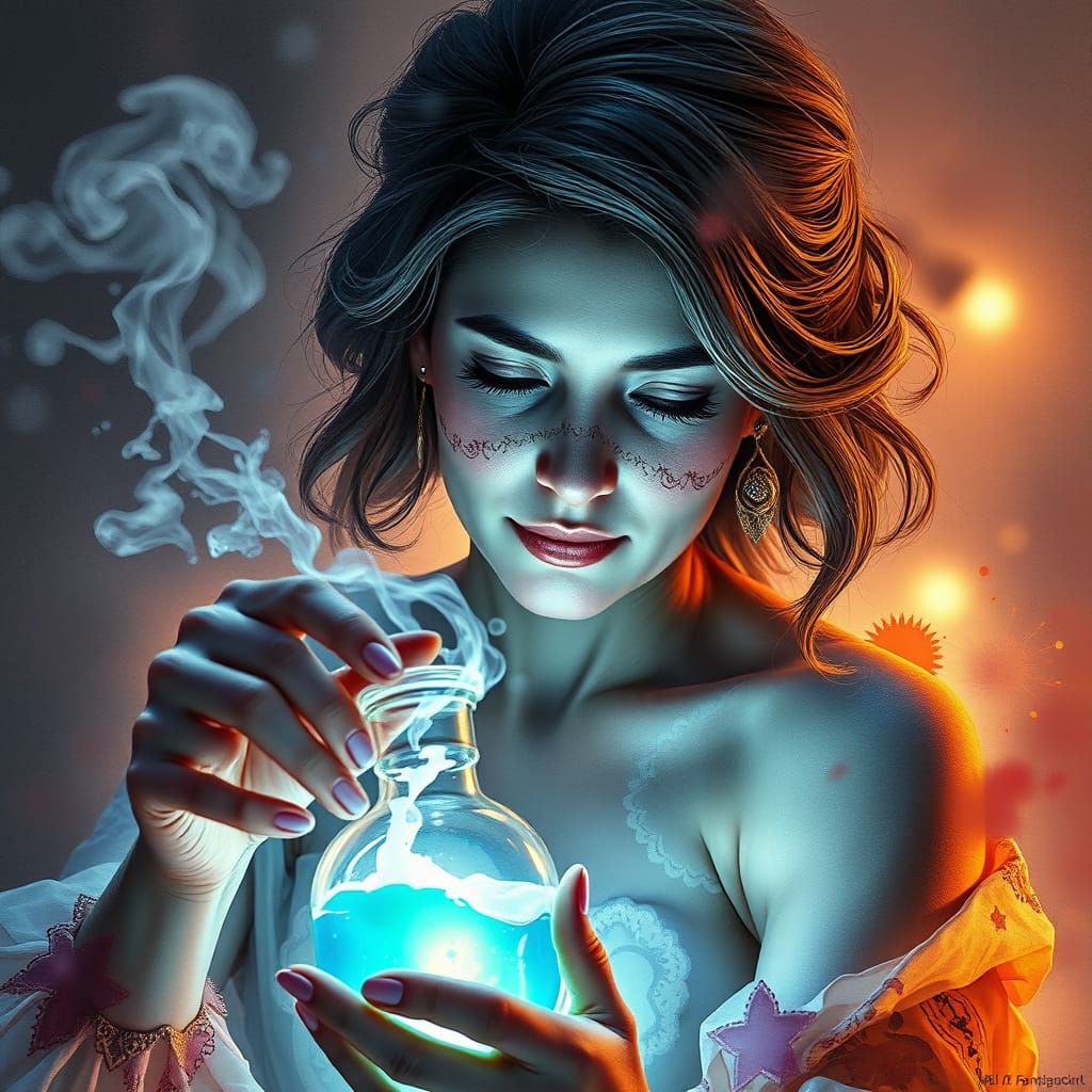 This image shows a monochromatic watercolor head and shoulders portrait of a beautiful middle-aged woman creating a love potion. The portrait features dynamic lighting and intricate details.