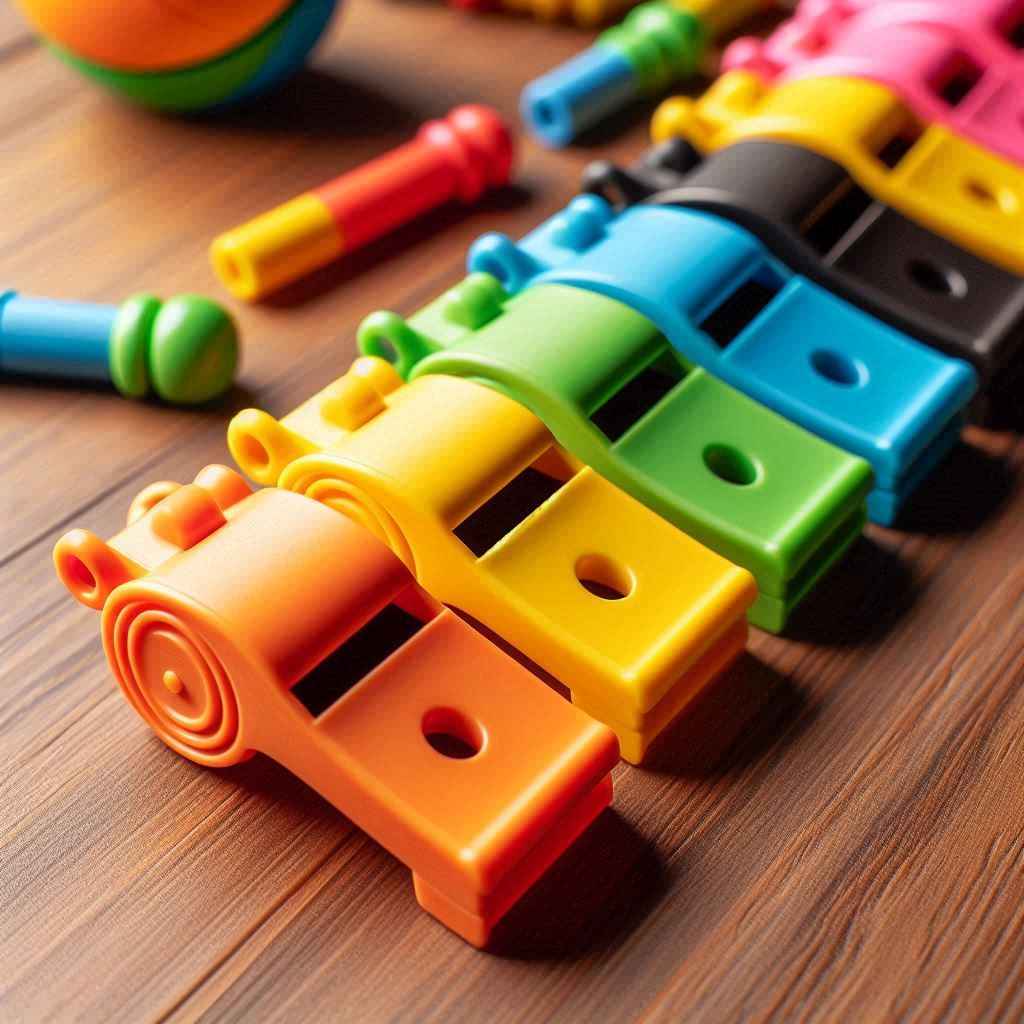 A closeup of a lineup of bright plastic slidewhistles. The whistles are arranged in a neat line, with each whistle a different color of the rainbow. The bright colors of the whistles are eye-catching and playful, making them perfect for a children's toy.