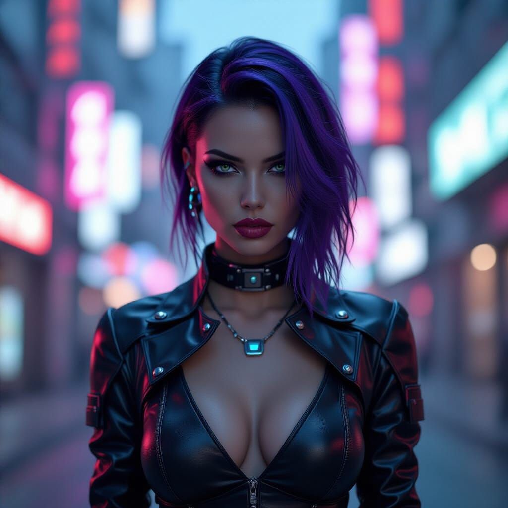 A hyperrealistic image of a powerful cyberpunk woman with intense eyes, short neon purple and blue hair, and futuristic leather attire. Dramatic lighting and urban background create a mysterious atmosphere.