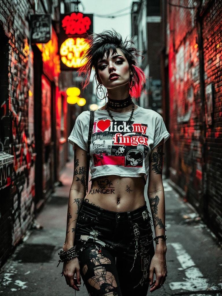 This image shows a punk woman in a white crop top approaching a club in a Boston alley. The image blends layered typography and hyperrealistic elements in a high-contrast, graphic style.