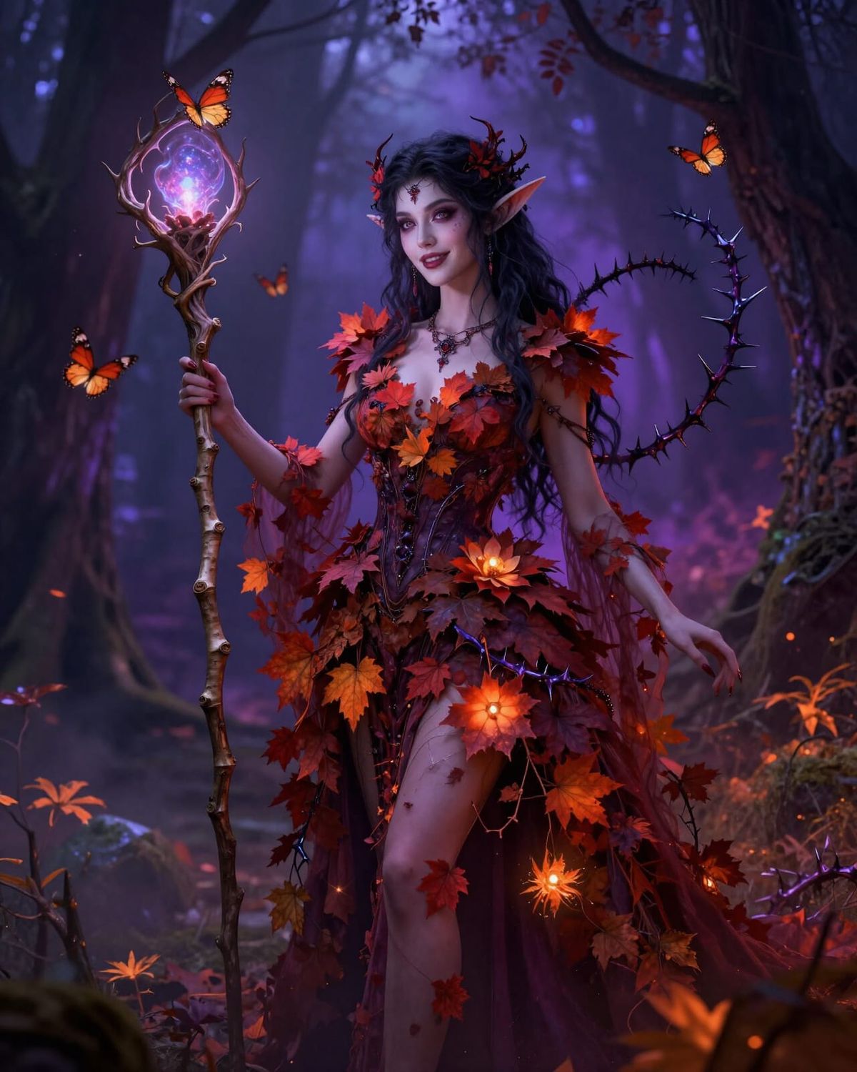 A striking image of an elven warlock embodying beauty and terror. Her gown features autumn leaves and night flowers, with spectral thorns and butterflies. Rendered in an elegant, menacing fantasy art style with dramatic lighting.