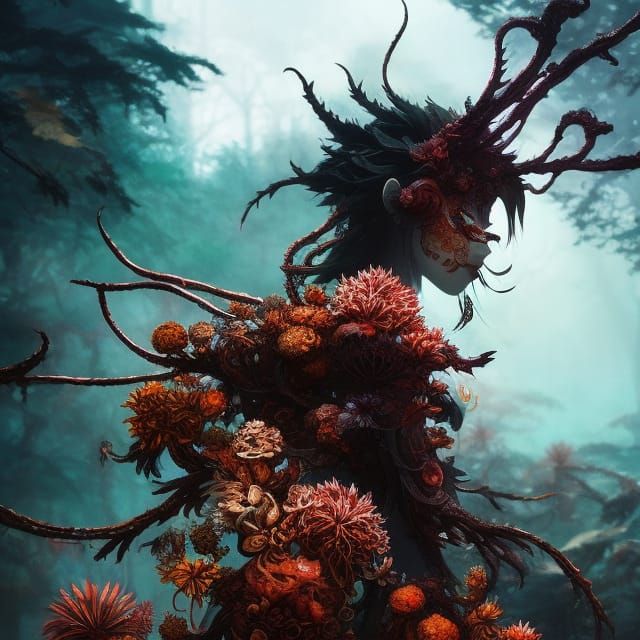 A stunning artistic rendering of a beautiful sinister cordyceps zombie by arai yoshimune, toshiko okanoue, sui Ishida, UHD, gorgeous coloring, collage work, hyperdetailed, fantasy tones, cel-shaded, clean linework, crisp, manga cover, gloomy, beautiful, horror