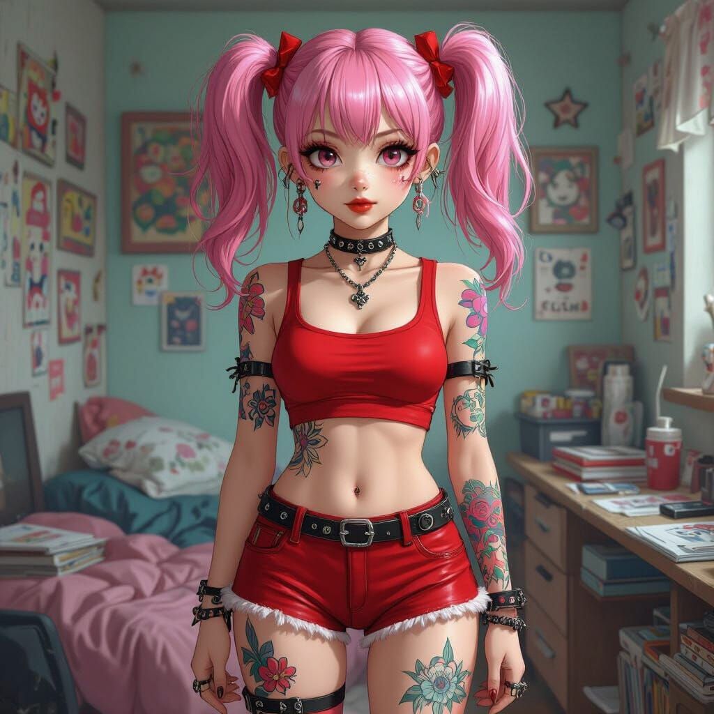 This image features an early 20's emo girl with candy cane colored pigtails and vibrant tattoos. The artwork blends Japanese pop art with gothic lolita elements.