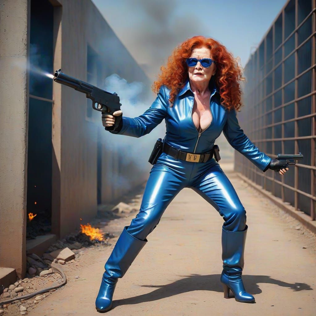 This image depicts an older, heavyset woman with red curly hair in a blue leather outfit, complete with gloves, sunglasses, and boots. She's firing a submachine gun with a muzzle flash.