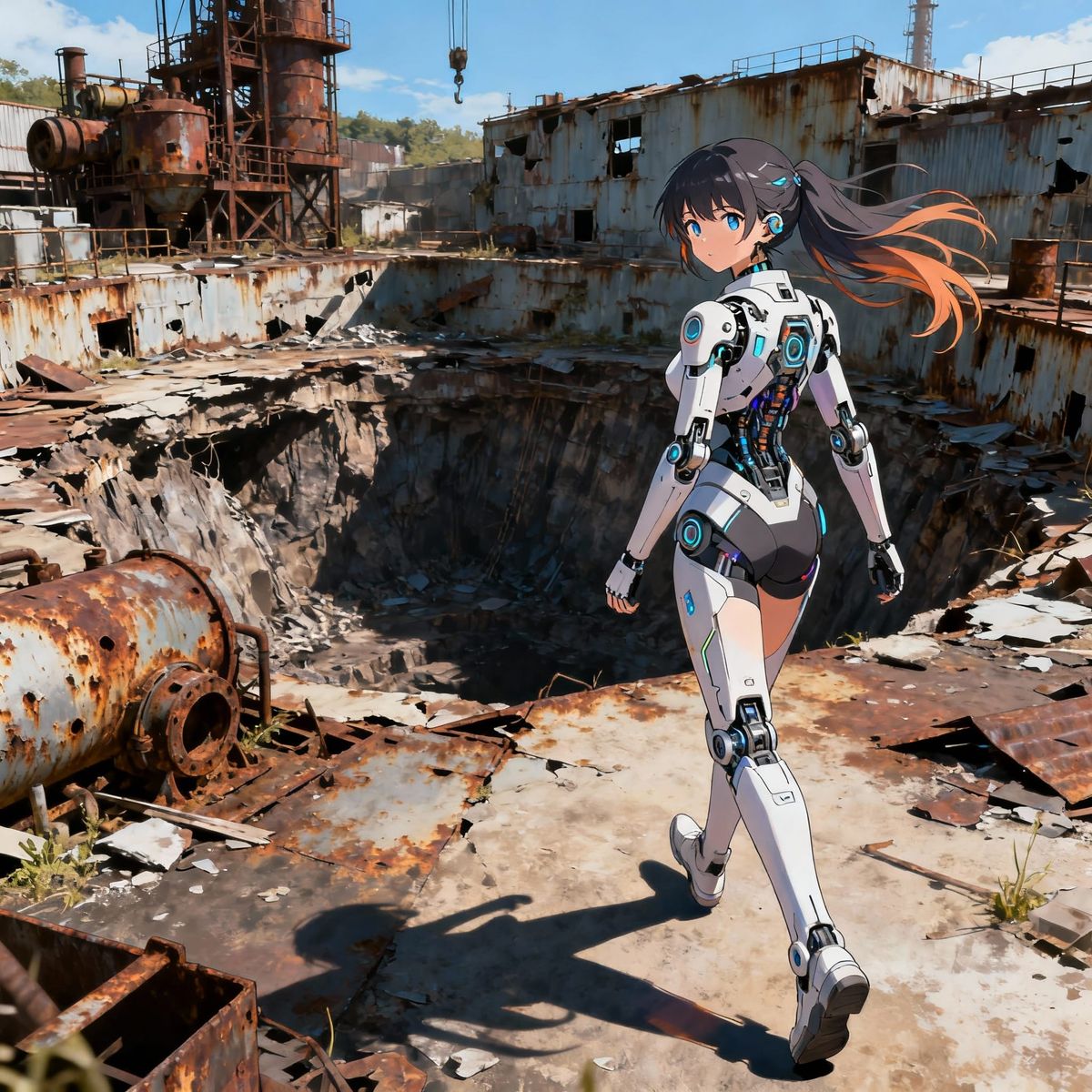 This image shows a full-body view of a sci-fi anime girl walking towards a broken, rusted open pit mine in an industrial outpost.