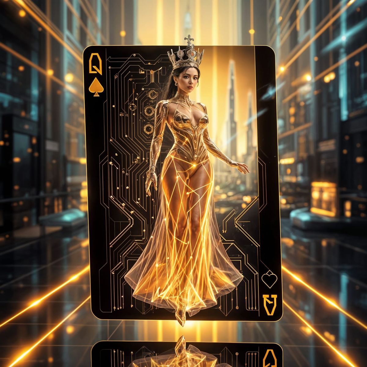 A stunning cyber-futurist Queen of Spades, crafted from crystalline alloys and light, steps from a glowing holographic playing card. The scene blends cyberpunk and art nouveau styles with a luminous gold, chrome, and black palette.