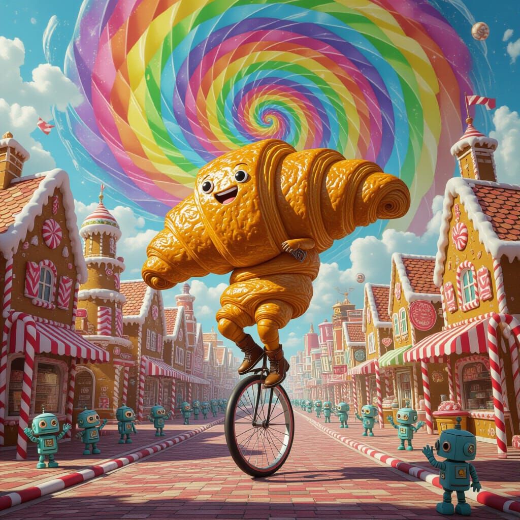 This image shows a surreal scene of a massive, sentient croissant cycling through a futuristic city constructed from gingerbread and candy. Tiny robots cheer from the streets under a sherbet sky, rendered in a candy core aesthetic.