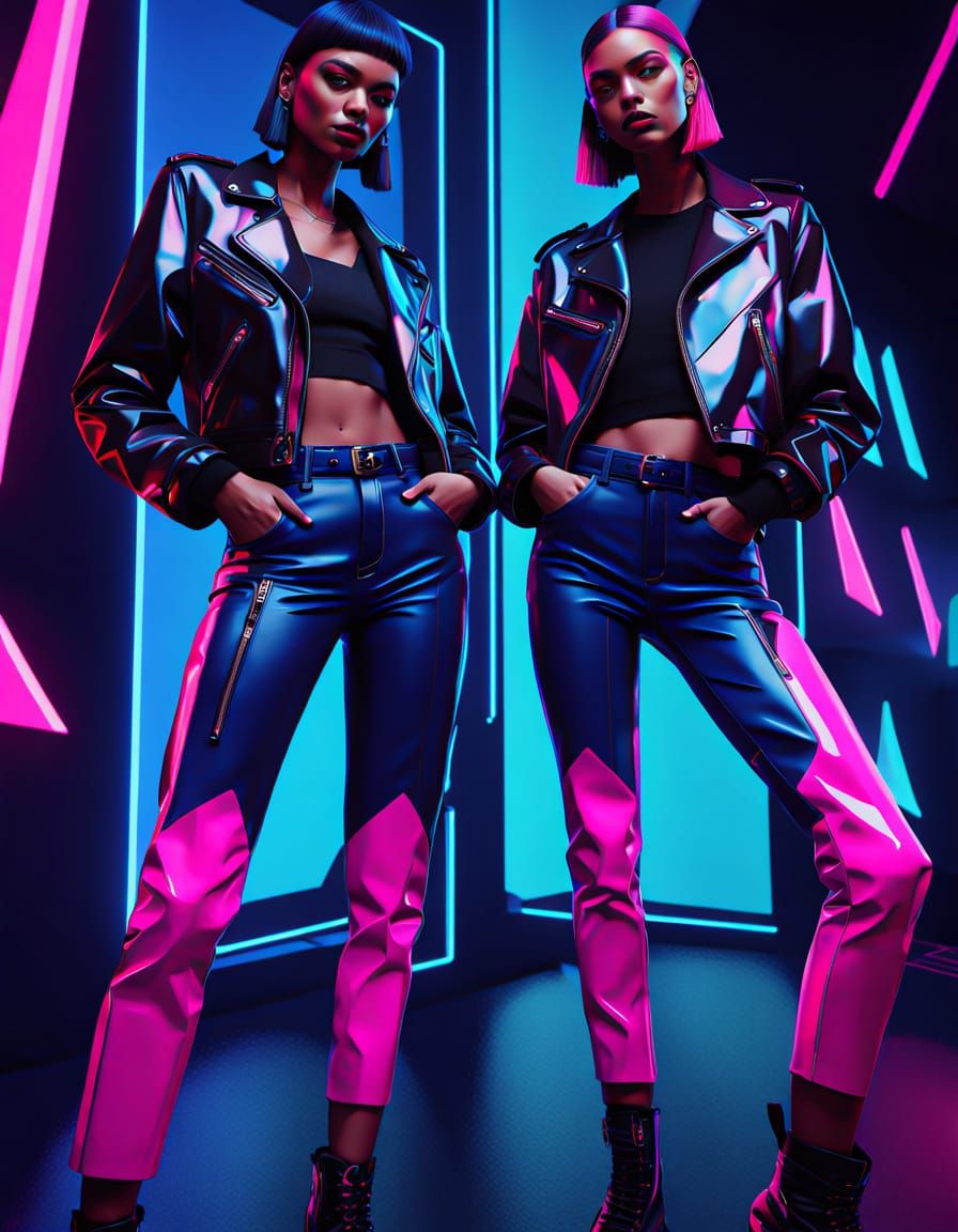 This vibrant painting depicts two women in a club, surrounded by neon lights reflecting off their leather jackets. The artwork blends Cubist and Fauvist styles with bold brushstrokes and high contrast lighting, creating a maximalist, synthwave-inspired aesthetic.