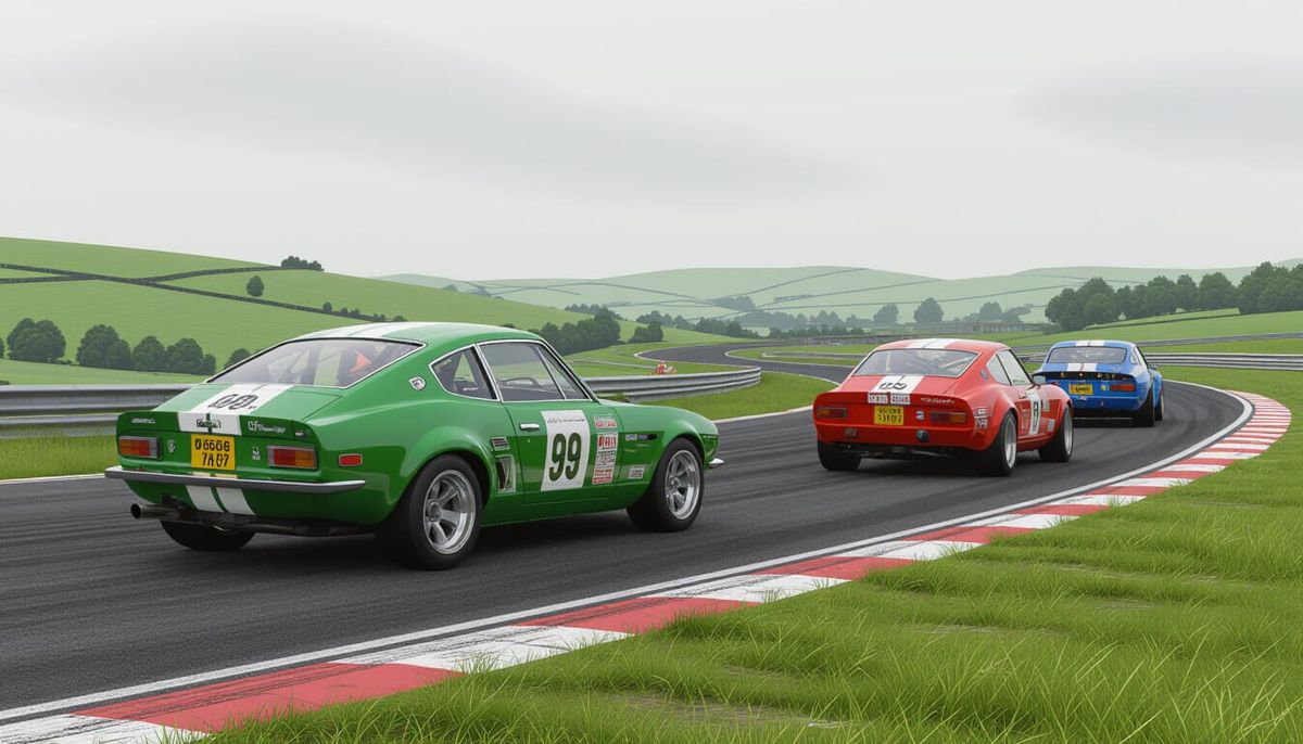 This image depicts the Donegal Rally in the 1970s. It shows low-powered sports cars racing on a black track, surrounded by a green countryside under a grey sky, in synthwave neon retro style.