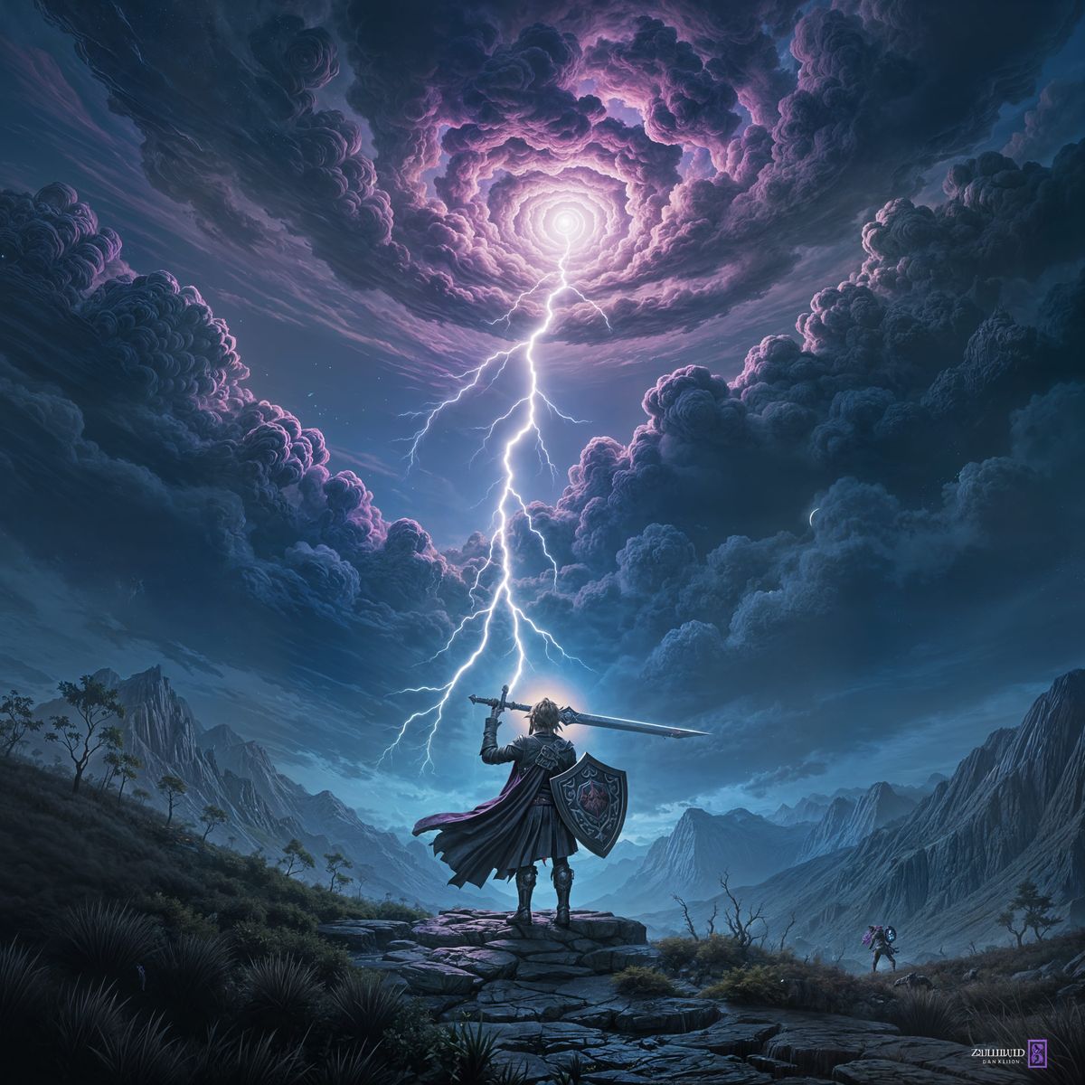 A digital painting of Dark Link with a deku shield, set against a dramatic sky. Purple lightning and dark clouds evoke a sense of foreboding in this fantasy concept art.