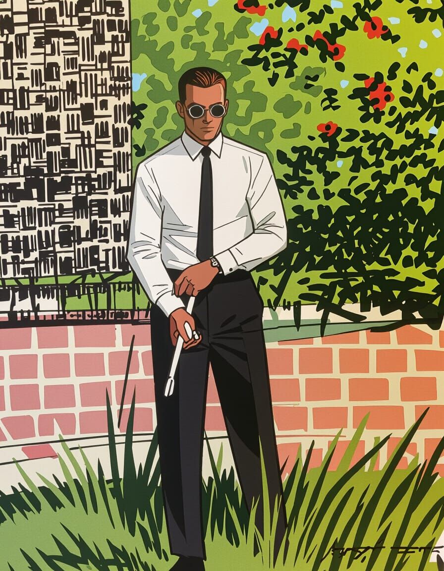 This image shows a powerful man in a black suit and dark sunglasses, styled as a graphic novel illustration. Dramatic lighting and bold shadows create a striking effect against a solid red background.