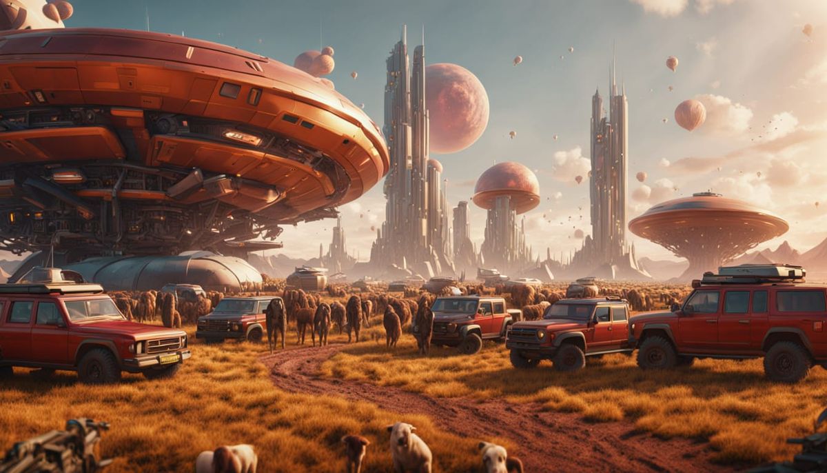 This image is a hyper-realistic digital painting of a space colony, featuring farmers and livestock standing near vehicles amidst a vivid, atmospheric scene with metallic surfaces and a dramatic color palette.