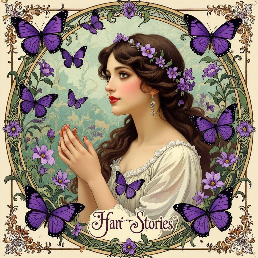A decorative YouTube banner featuring the name Hakima Stories amidst purple butterflies and flowers. The design evokes a dreamy, whimsical aesthetic with intricate details in an art nouveau style.
