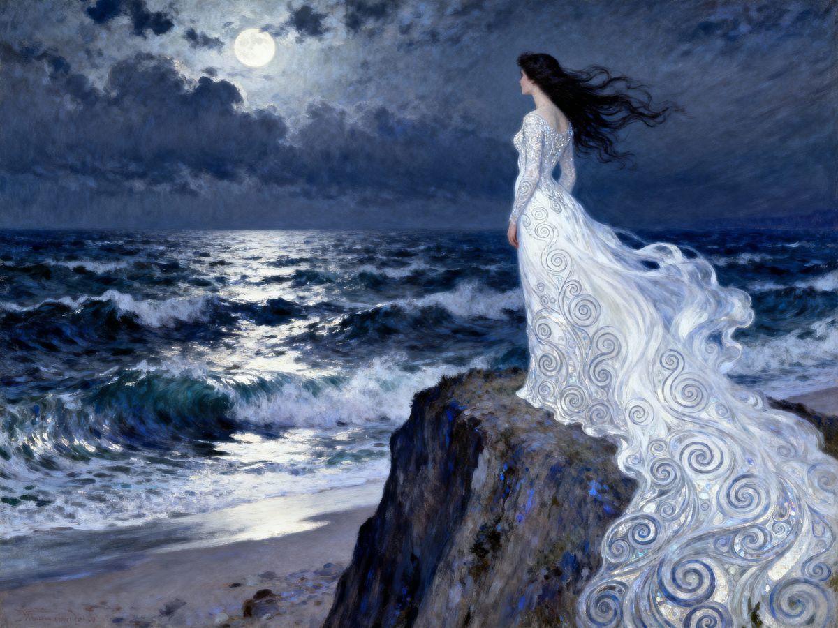 A majestic woman in a flowing white dress stands on a cliff overlooking a stormy sea. The artwork features dynamic lighting and a muted, shimmering color palette evoking mystery.