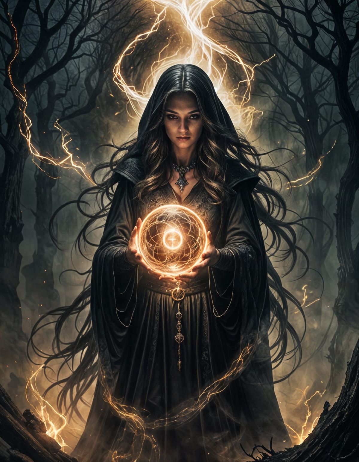 A striking picture of a witch casting a spell to summon a magical orb. This full body action illustration showcases an intricate, elegant, and fierce character in a dynamic pose, set against a backdrop of glowing mist.