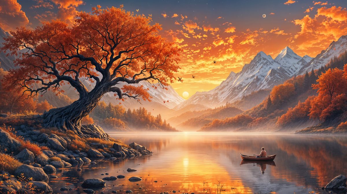 A serene landscape painting capturing the vibrant beauty of autumn, with a tranquil lake reflecting the warm colors of a sunset, majestic trees, and a peaceful fisherman in a photorealistic style.