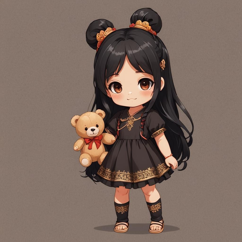 This image shows a charming chibi-style girl with long, dark hair and brown eyes, dressed in a dark brown dress and holding a teddy bear. The artwork has a cute, playful aesthetic.