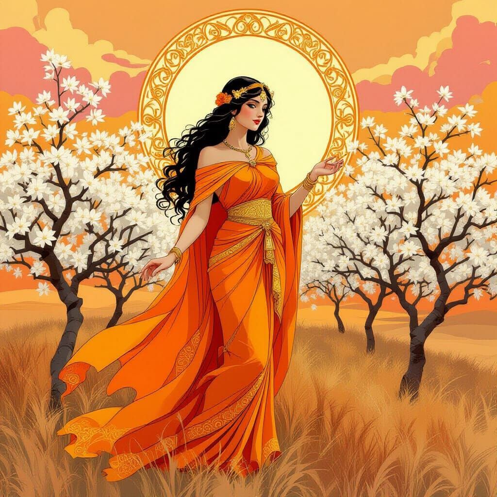 A stunning image of a goddess in orange and gold, surrounded by blossoming trees under a vibrant sky. This artwork features intricate Art Nouveau details with soft, ethereal digital painting qualities.