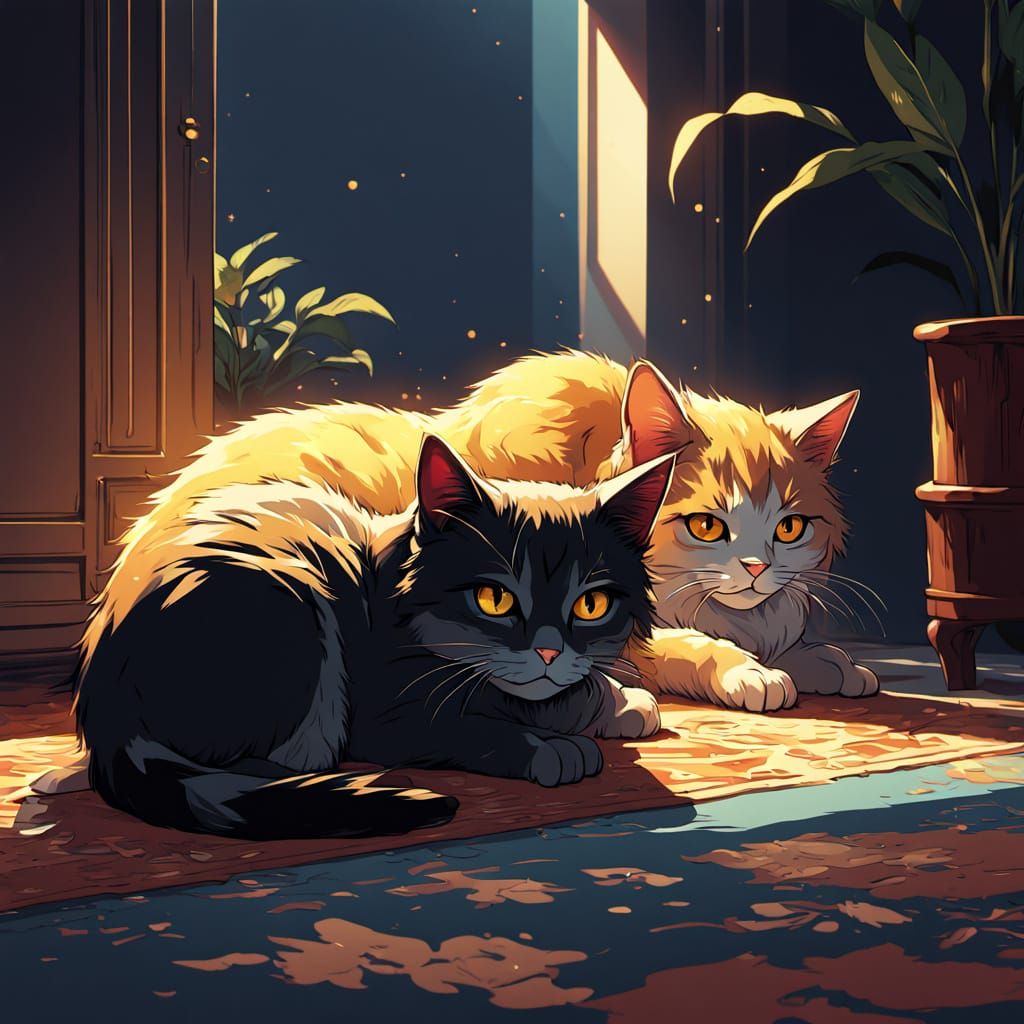 This stunning anime-inspired image showcases two cats lounging in sunbeams on a plush carpet, surrounded by deep, rich patterns and vibrant, flat colors reminiscent of Studio Trigger's cinematic style.