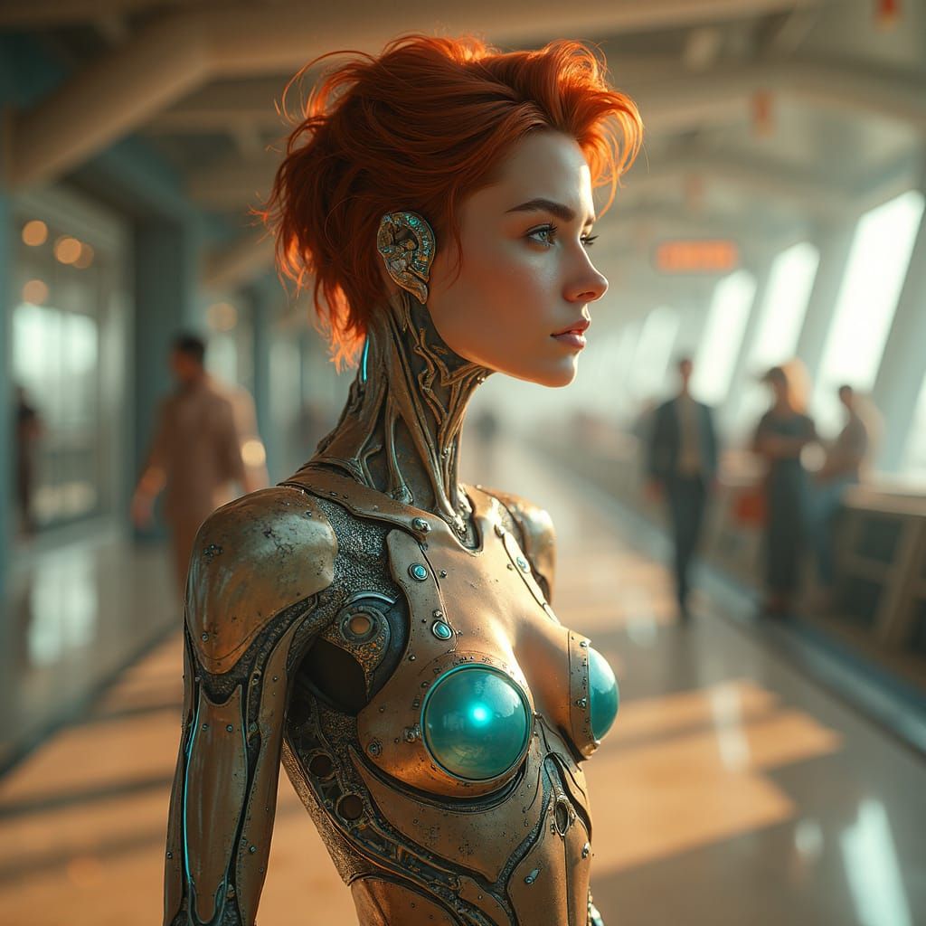 This image depicts a serene female figure in a futuristic space elevator terminal, blending traditional Silk Road styles with advanced space age materials. Her synthetic skin shimmers with constellation patterns, while her hair and eyes incorporate cutting-edge technology.