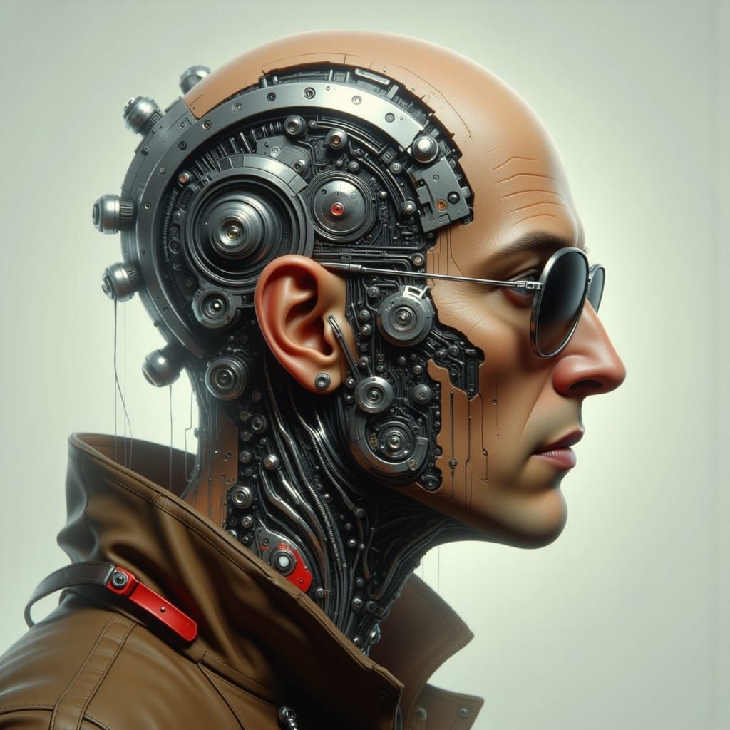 This digital artwork showcases a hyper-realistic cyborg portrait of a man with mechanical parts integrated into his head. He wears sunglasses and a jacket against a neutral background.