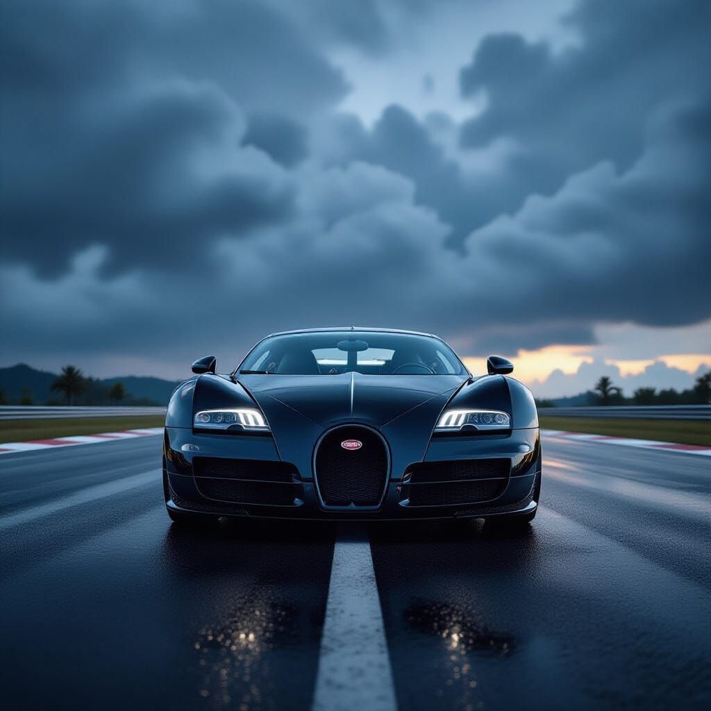 This image captures a black Bugatti Veyron on wet asphalt at Sirkuit Mandalika. Cinematic lighting and a wide-angle lens create a dramatic, mysterious atmosphere under dark storm clouds.
