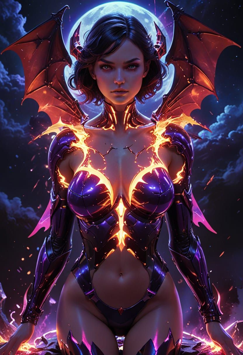 A striking picture of a muscular, androgynous female figure reclining on skulls. The cel-shaded graphic novel art features glowing neon circuits, swirling flames, and vibrant psychedelic colors in a retro-futuristic style.