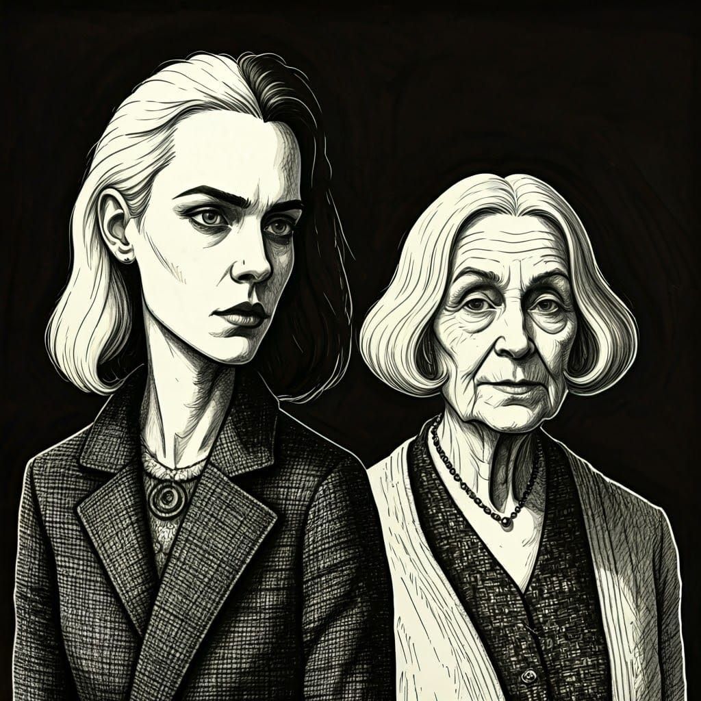 This image depicts four figures rendered as an ink drawing. It shows two women, one androgynous person, and a grandmother with a bob haircut.