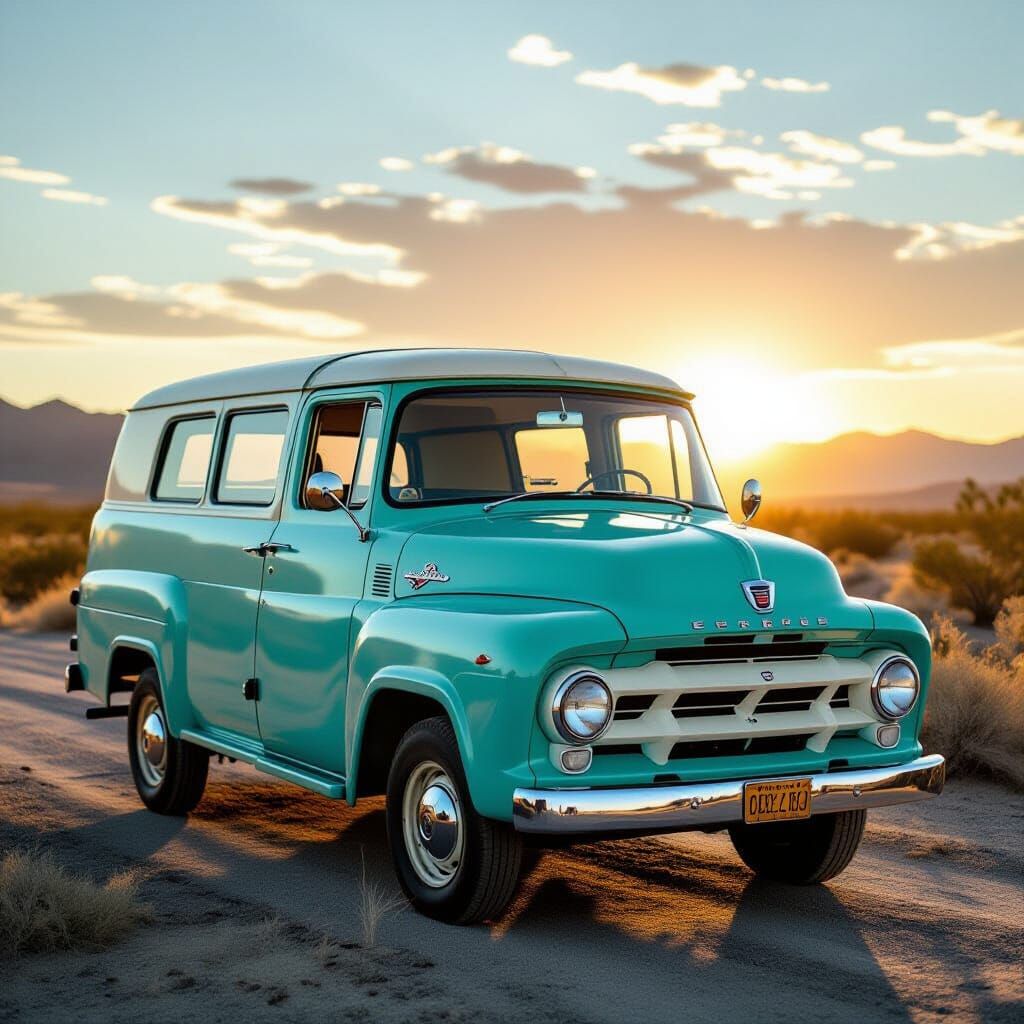This image shows a vintage 1950s Ford Econoline van in faded turquoise and cream, parked on a dusty desert road at sunset. Ethereal light filters through the windshield, captured with a soft-focus, dreamlike photorealism.