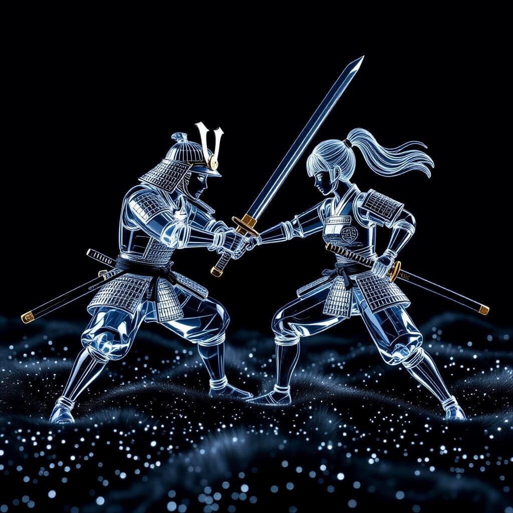 This image shows a transparent anime samurai couple engaged in combat with a glass sword and shield. Rendered in hyperrealistic 3D with intense shadows and immense detail.