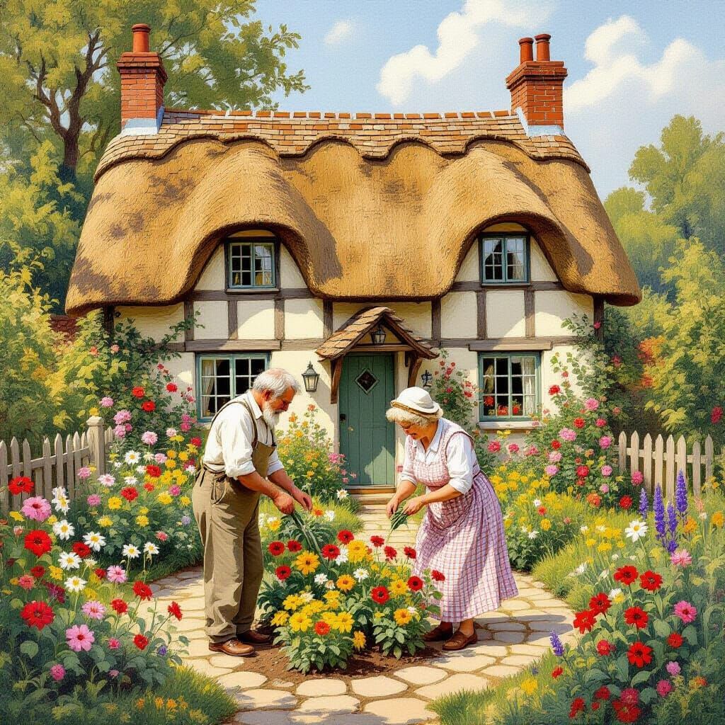 This image depicts a quaint English cottage with an elderly couple gardening. The vibrant scene evokes a sense of warmth and serenity in a classic painterly style.