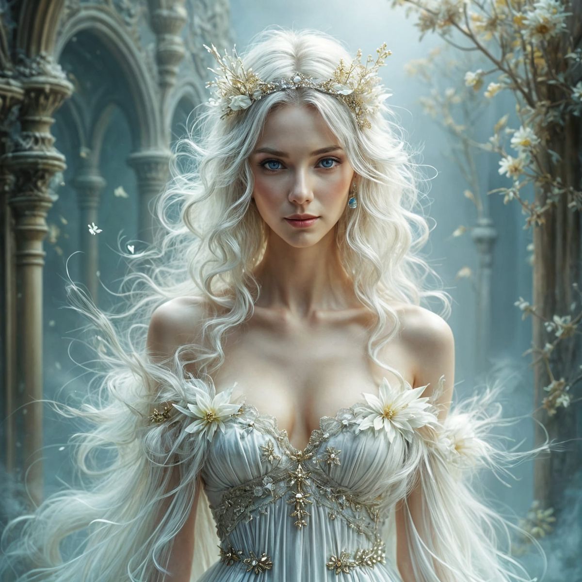 A stunning image of a princess in a white dress, standing in a misty fog with a gentle smile and blue eyes, her long white hair flowing behind her, adorned with a crown of beauty and perfection