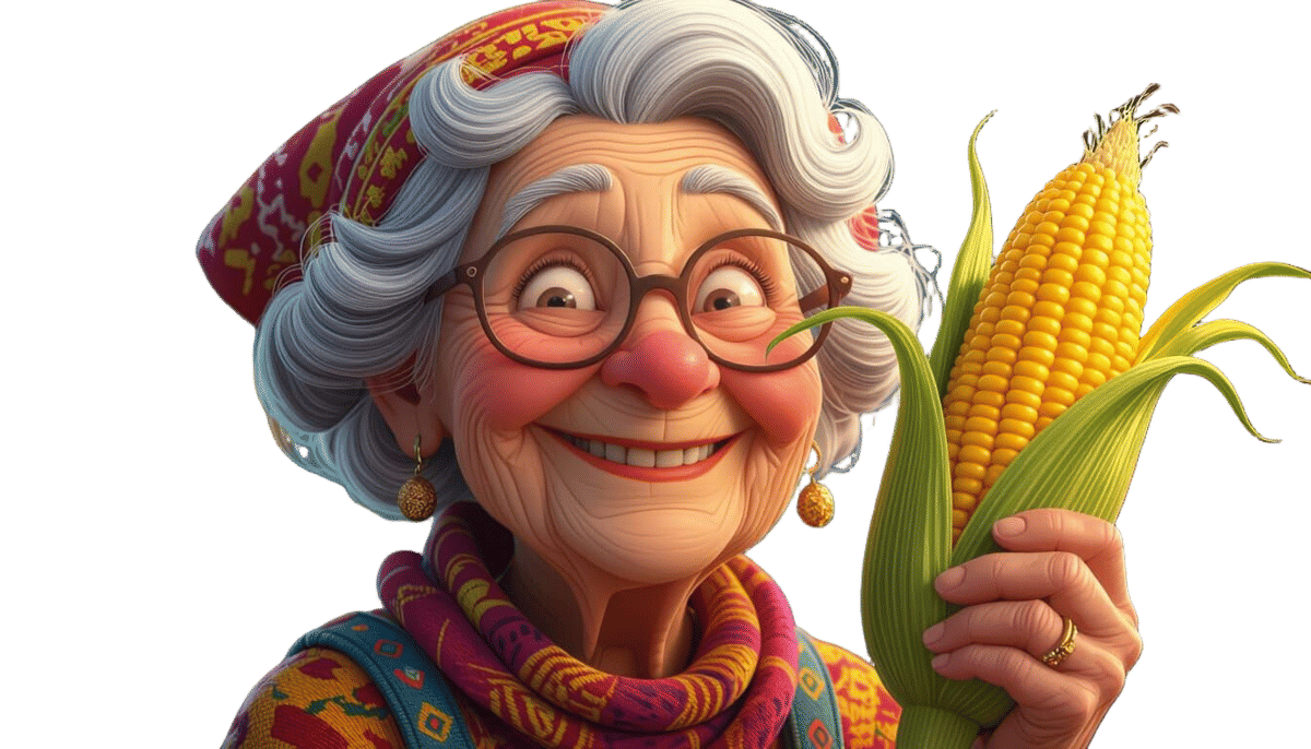 This image shows a hyperrealistic cartoon of a funny old lady made from a corn cob. The 3D character is intricately detailed with vibrant colors and dramatic lighting.